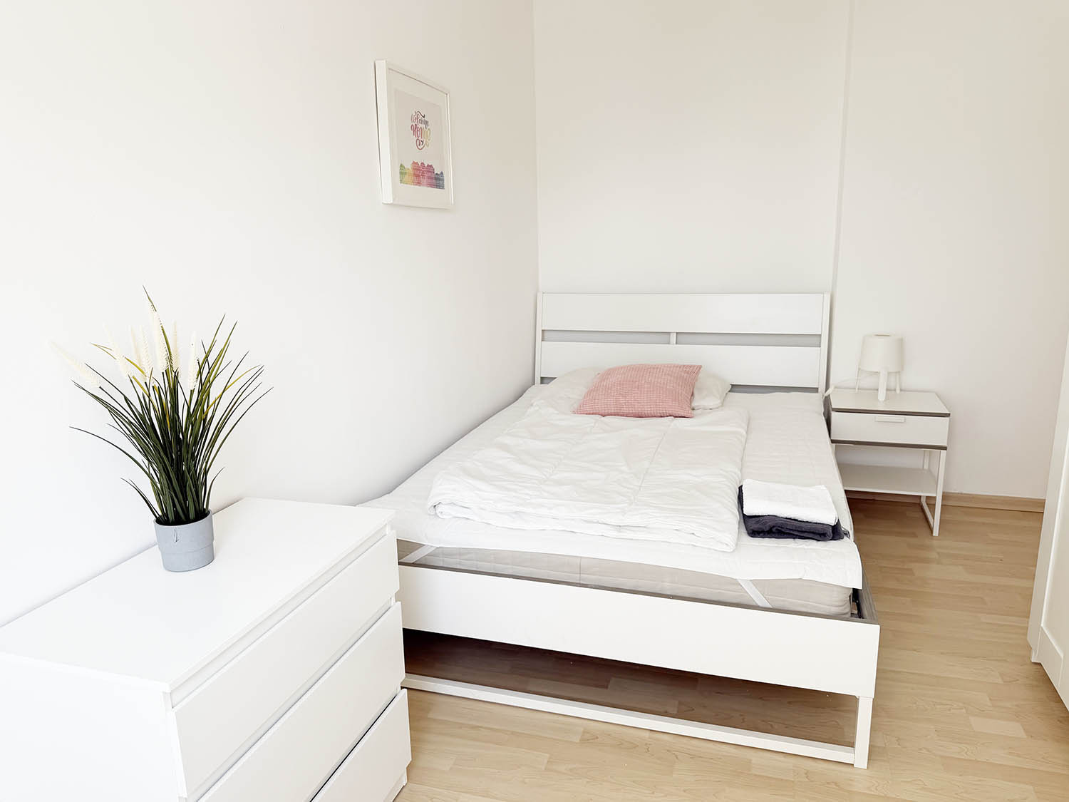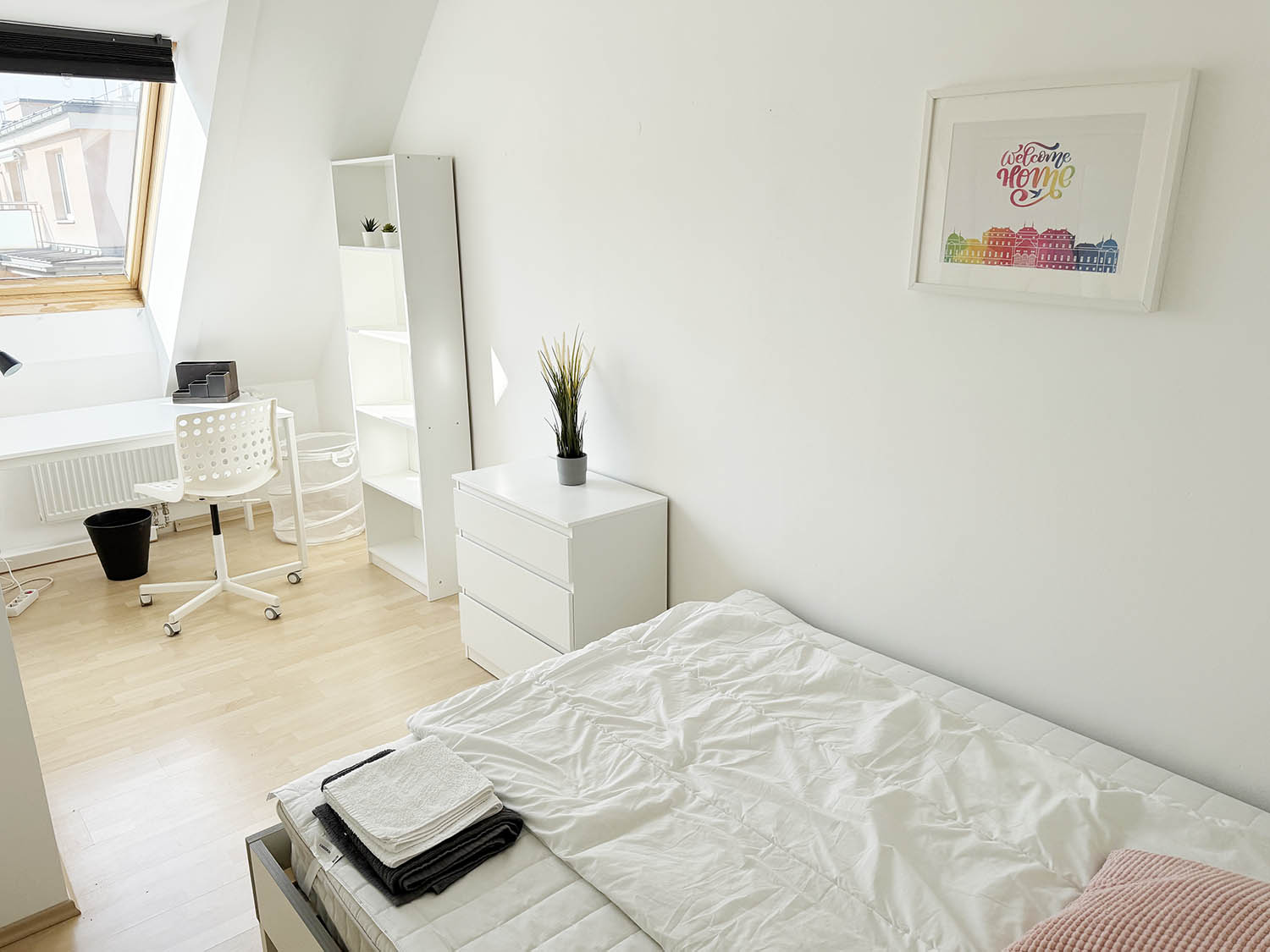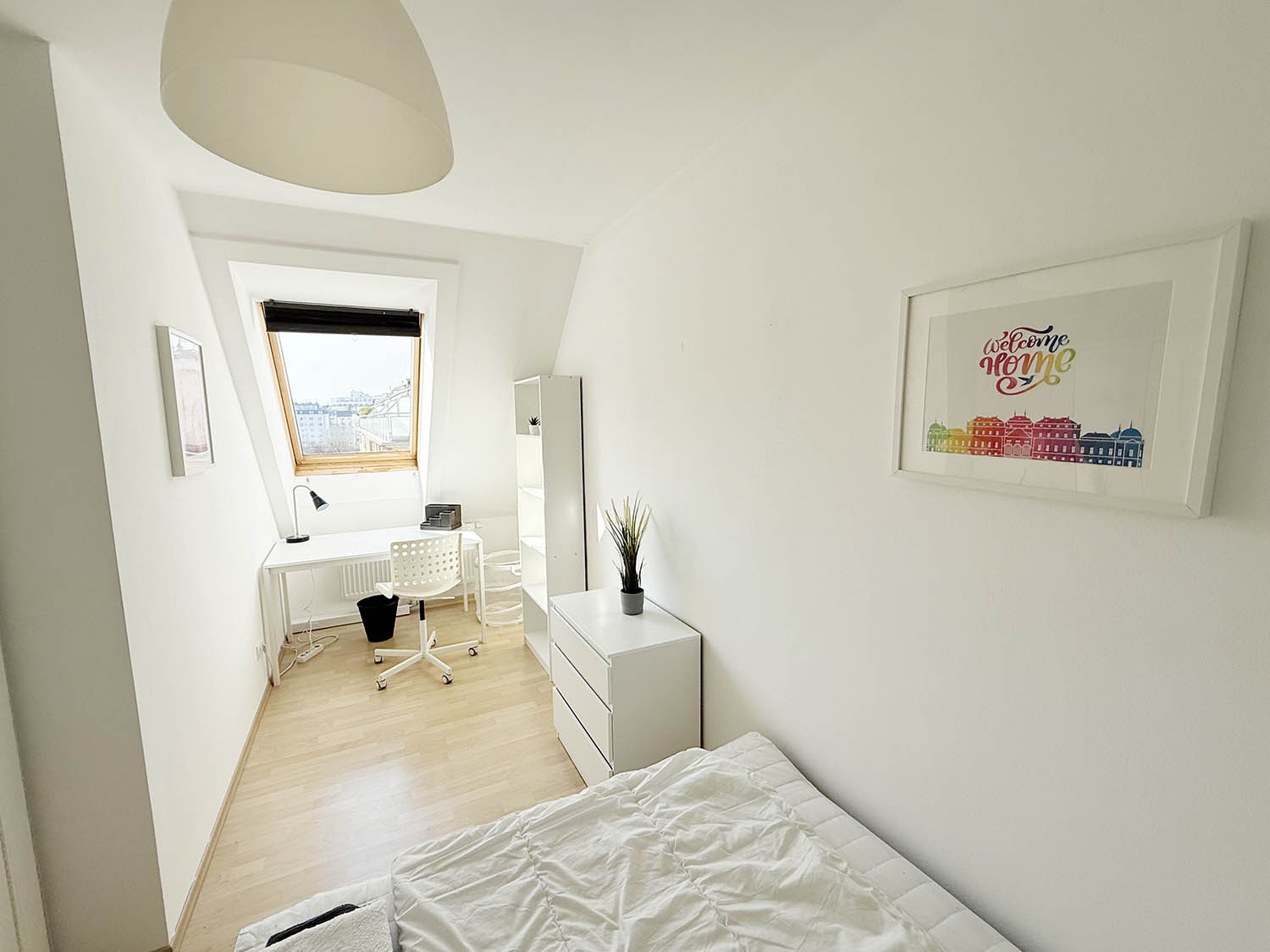 In your room you will find a comfortable double bed, a chill area with a couch, fresh linen, wardrobe and a workspace). In the apartment you have everything you need (washing-machine, hair drier….) and more. Everything (heating, electricity, internet etc.) is included in the price (All-In), so you can move in directly without worrying about anything.
