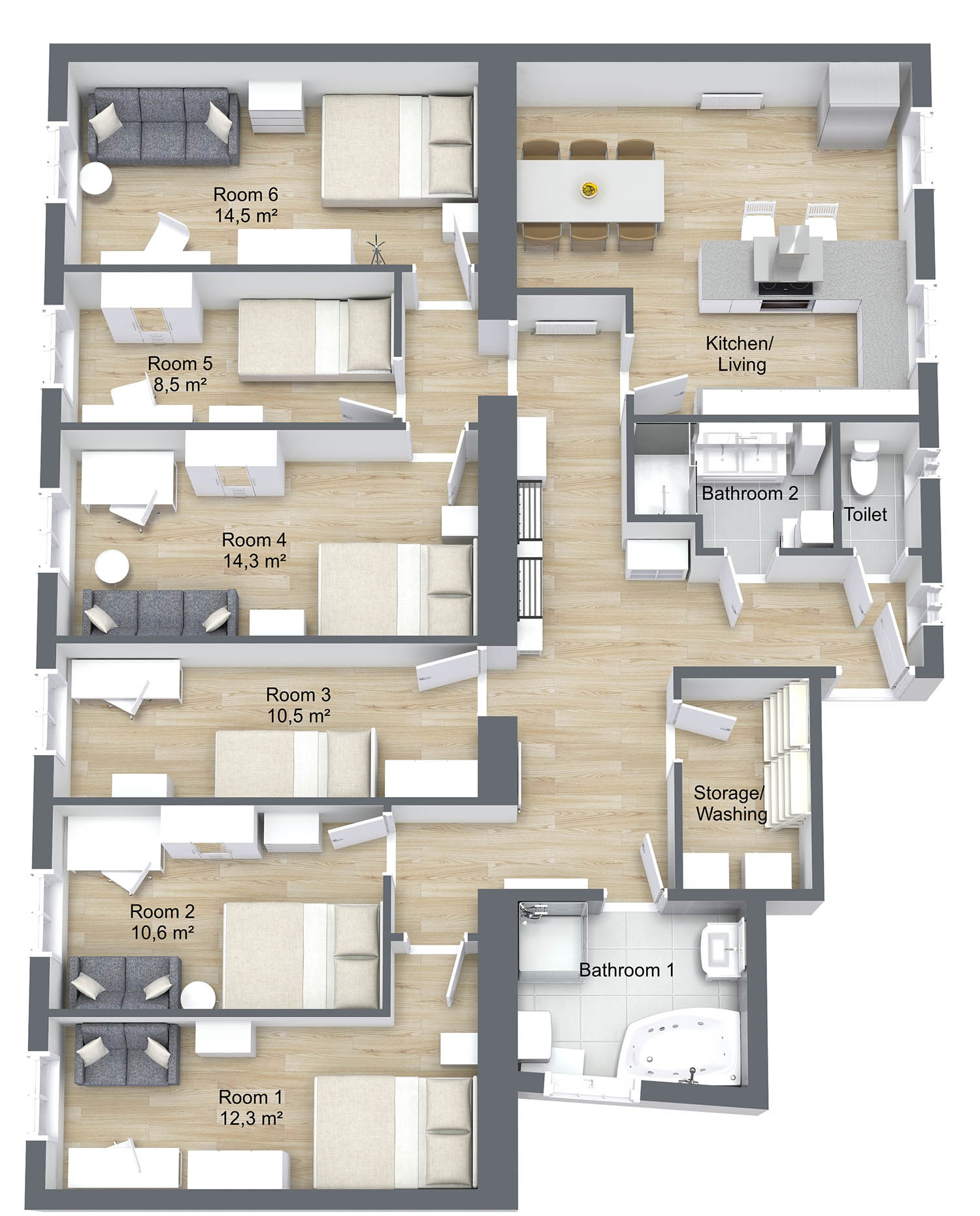 Each of the six private rooms is fully furnished and includes a bed with fresh linen, wardrobe, and a dedicated workspace. The apartment also offers a fully equipped kitchen, washing machine, and high-speed internet, ensuring comfortable and convenient everyday living.