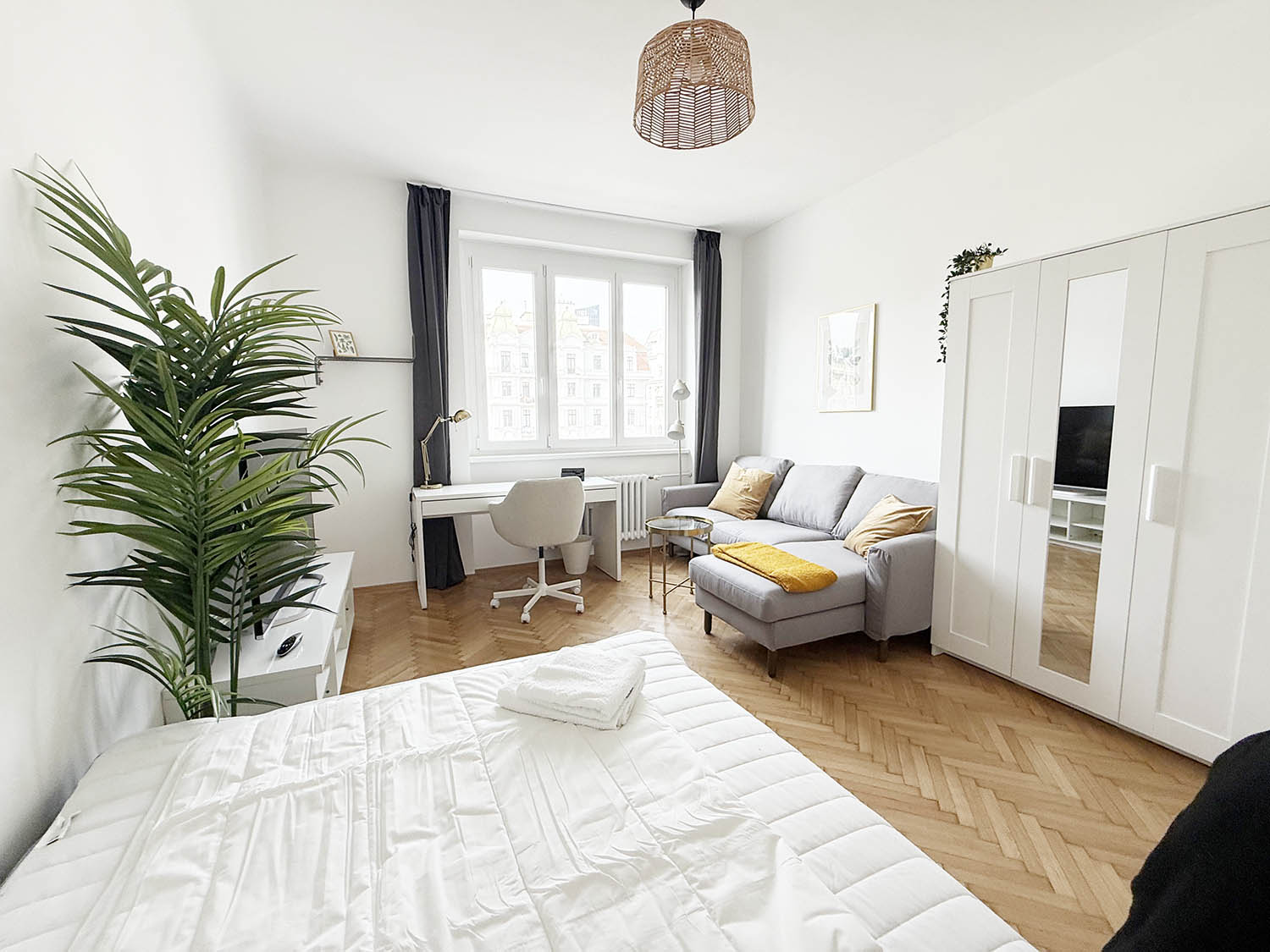 With a comfortable double bed, a big sofa, fresh linen, wardrobe and a workspace, a fully equipped kitchen, a washing-machine, hair drier (and much more), you will have everything you need. Everything (heating, electricity, internet etc.) is included in the price, so you can move in directly without worrying about anything.