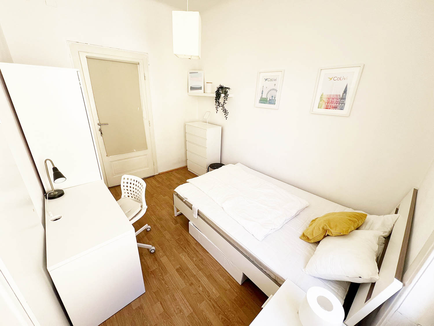 The apartment is located on the 2nd floor and has a kitchen with fridge, cooking utensils and crockery, a washing machine and wireless internet. All rooms are separately accessible and fully furnished. You have a double bed, a wardrobe, a bedside table, a desk, a chair, shelves and lamps.