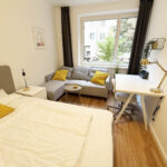 It is located on the 1st floor of a nice building and is fully furnished. It is equipped with a kitchen with a fridge, cooking utensils and crockery, a washing machine and WiFi. All rooms are of course separately accessible. In your room you will have a double bed, a couch, a wardrobe with mirror, a bedside table, a desk, a chair, shelves and lamps.